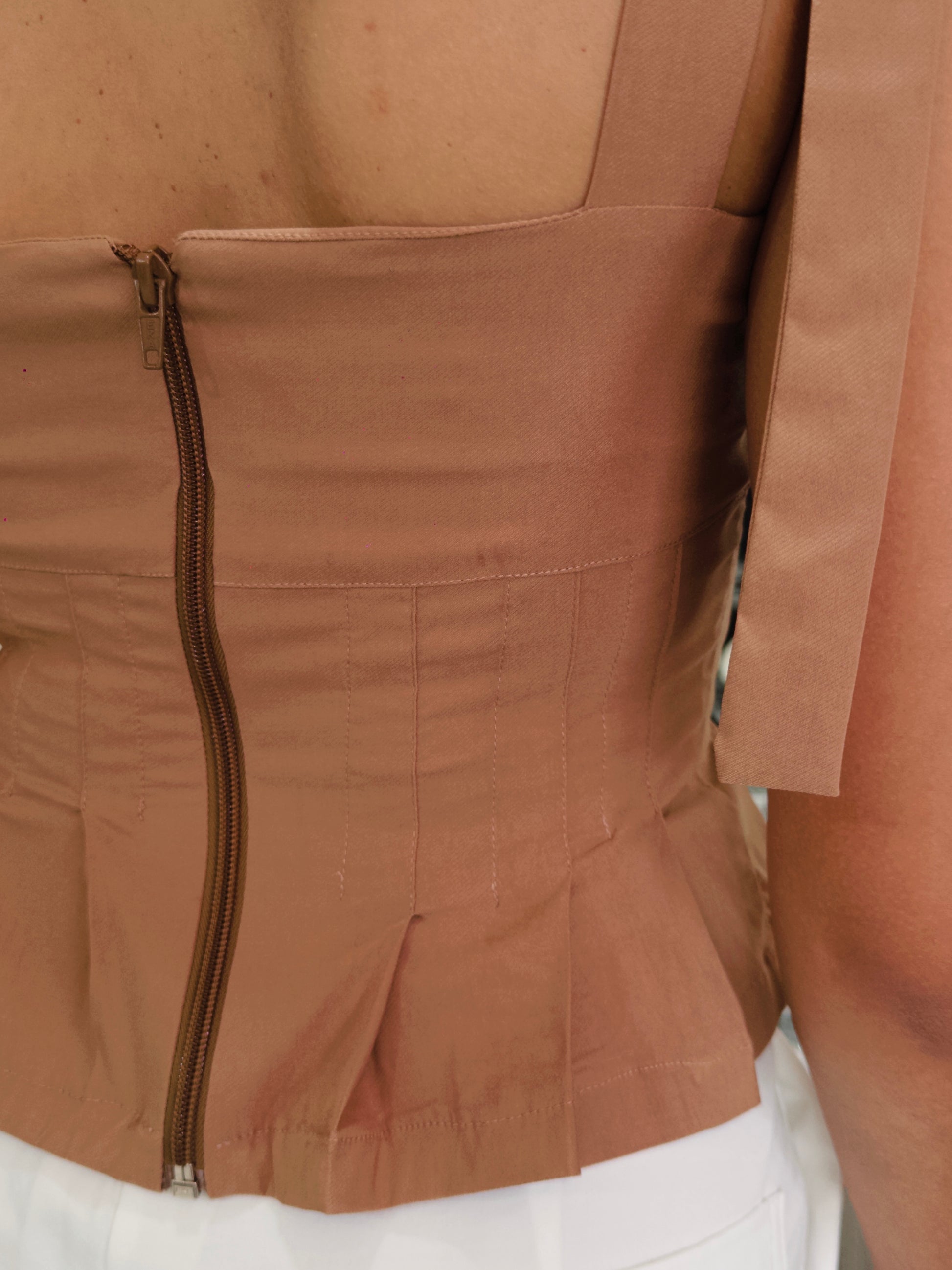 - Blusa estructurado en tono café con detalle de lazos ajustables en los hombros.