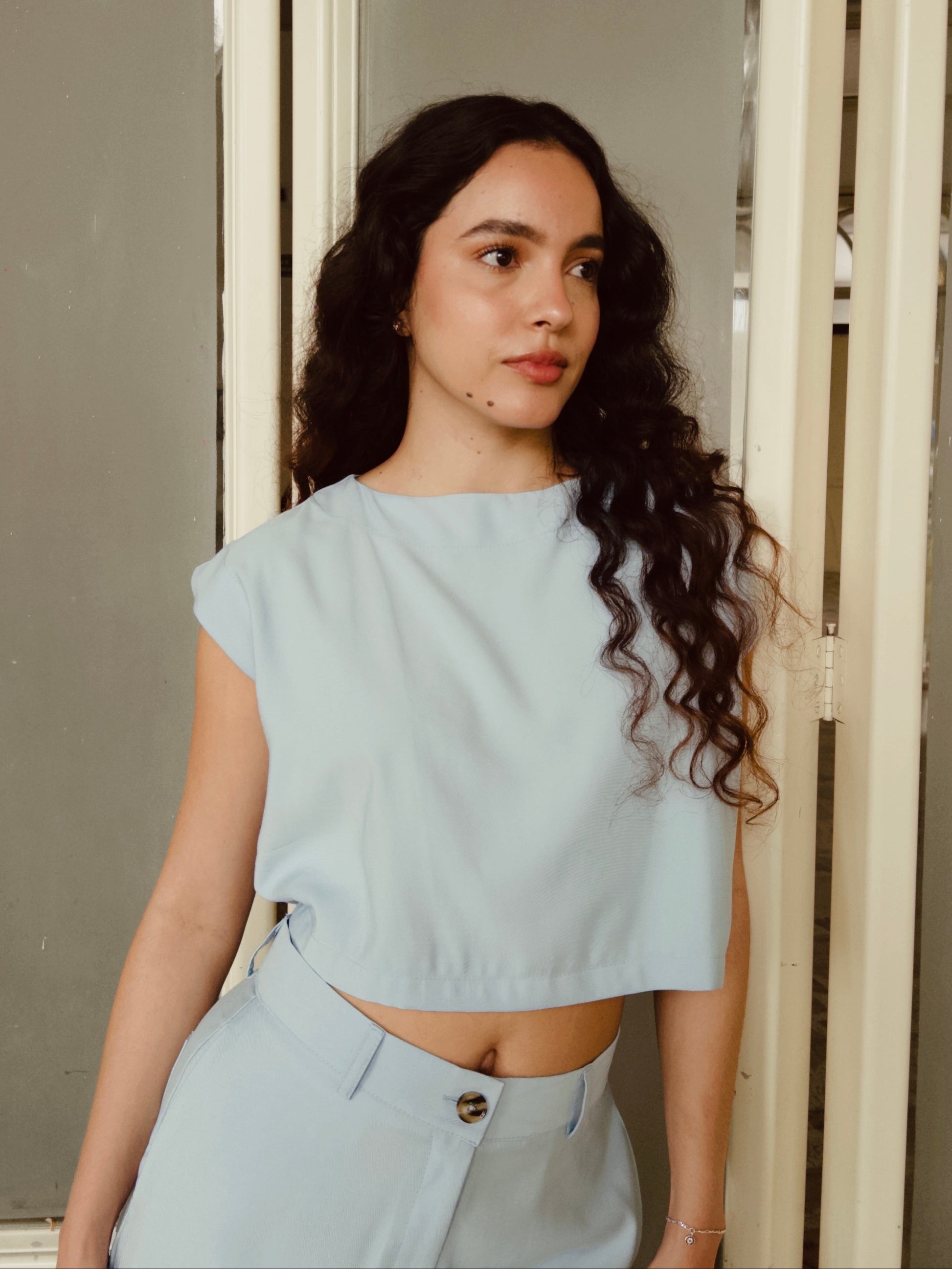 - Cuenta con mangas cortas tipo “cap” y un largo cropped que realza la cintura.