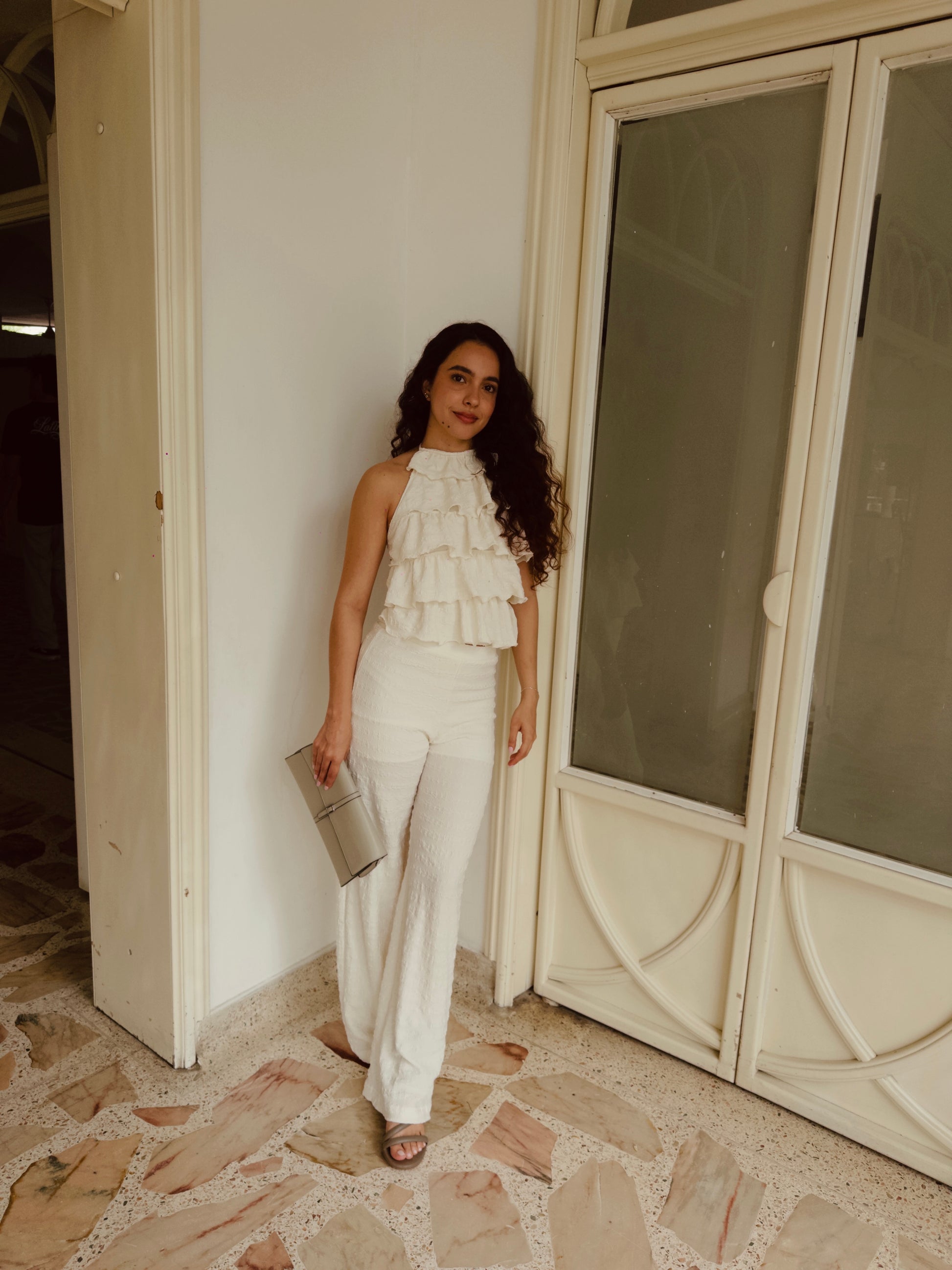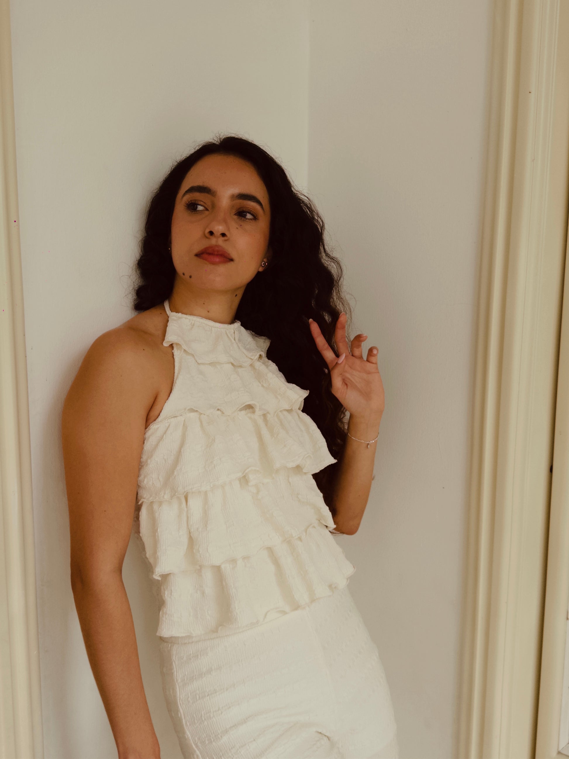 - Su diseño de cuello halter se complementa con volantes en capas, que aportan movimiento y un aire romántico sin perder frescura.