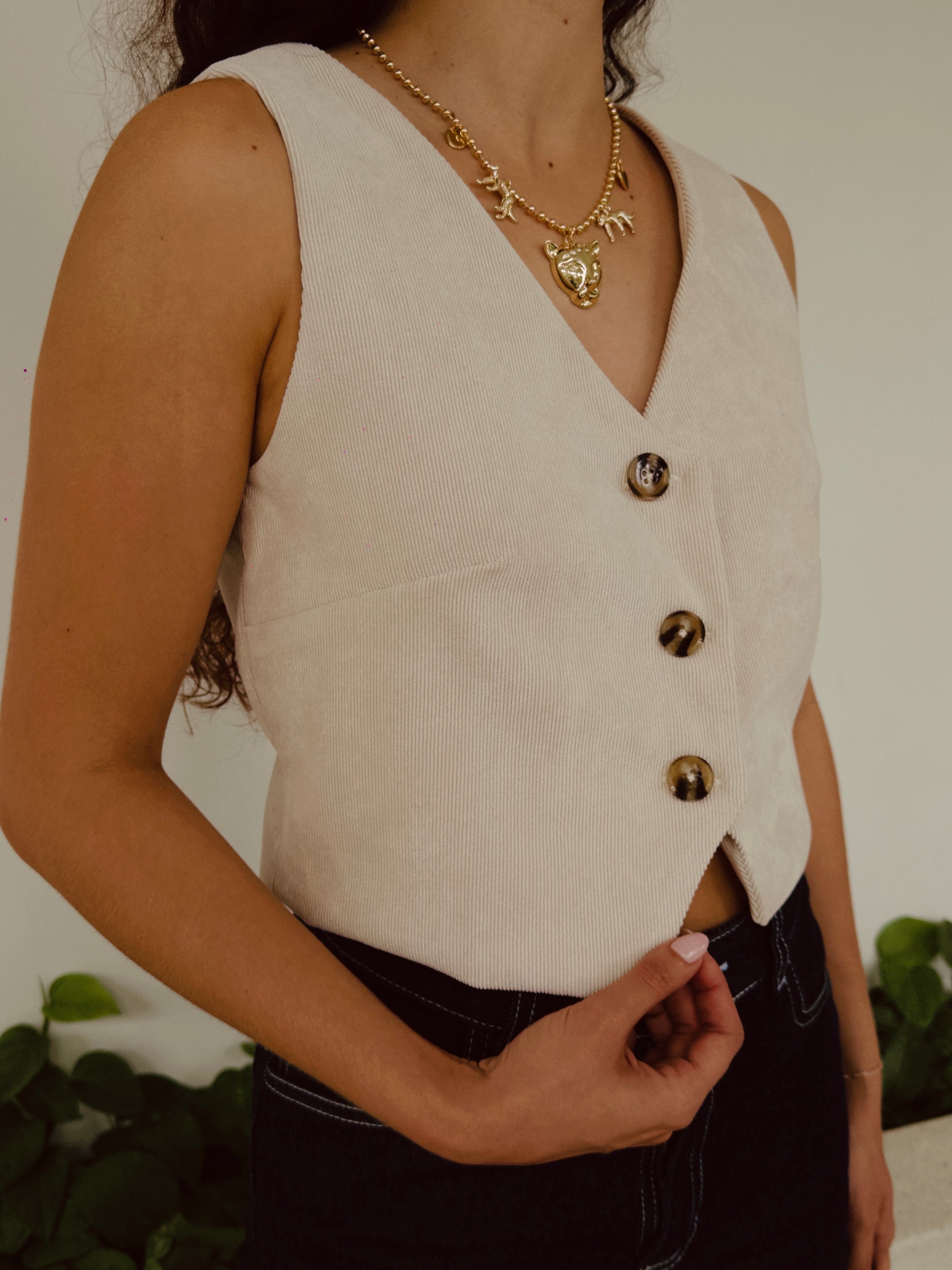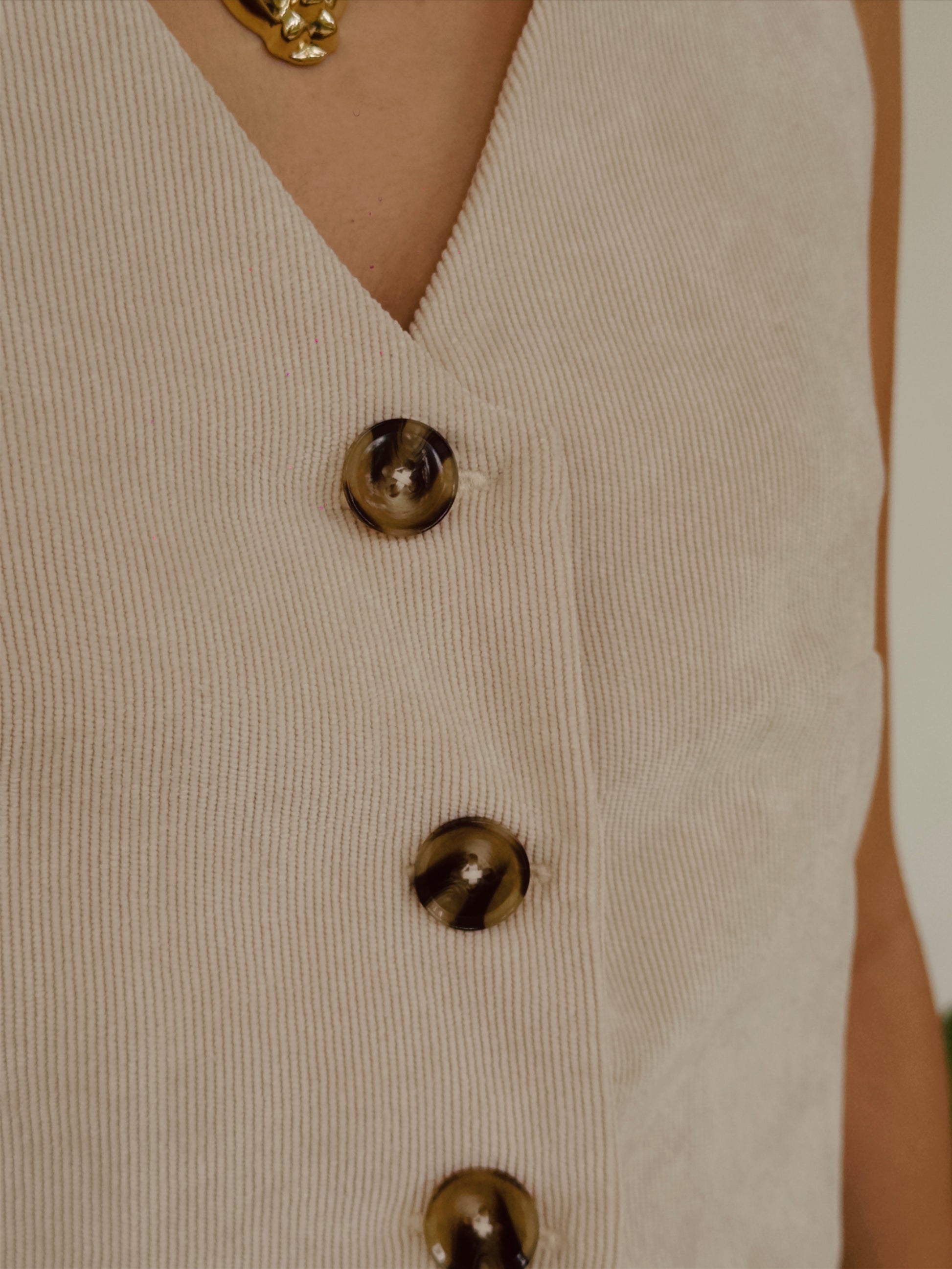 - Chaleco confeccionado en pana suave con textura acanalada característica.