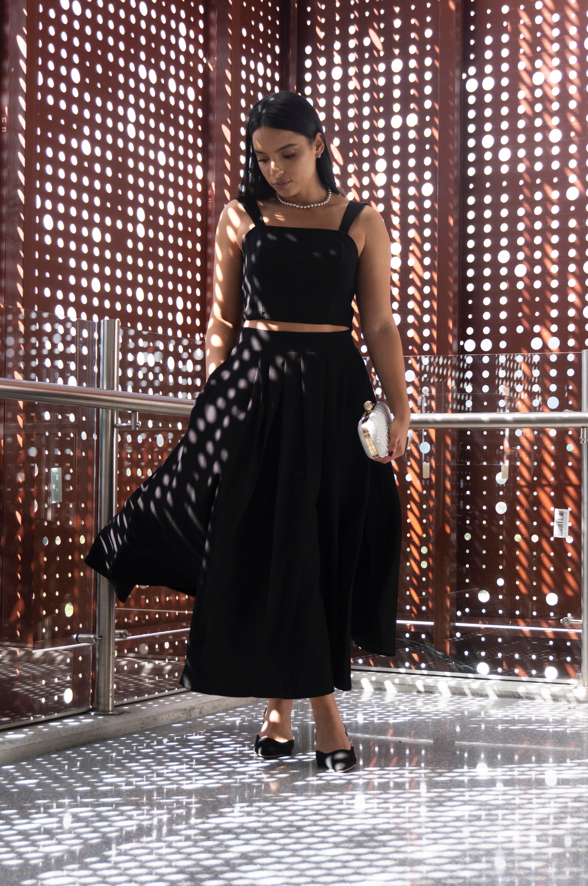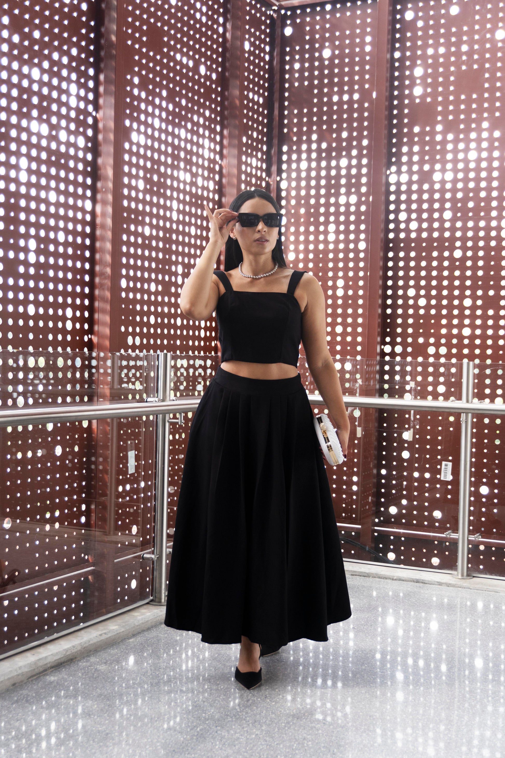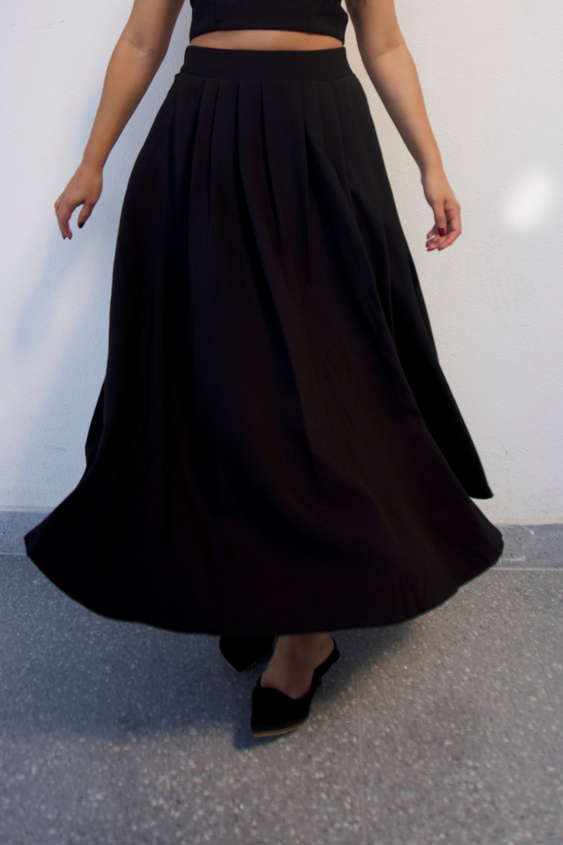 - Falda de largo midi en tono negro, confeccionada en lino con caída fluida.